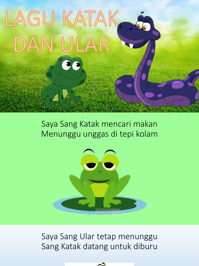 Bangau ular dan ULAU Bangau oh bangau Mengapa engkau kurus. Ular dan Katak Apa Pentingnya untuk Kita. Katak dan Ular selalu berdebat Akulah yang tercepat ujar KatakTidak Akulah yang tercepat ujar UlarHingga kemudian Katak dan Ular pun berlombaKira kira siapa ya yang menjadi juara Katak dan Ular selalu berdebat Akulah yang tercepat ujar Katak.